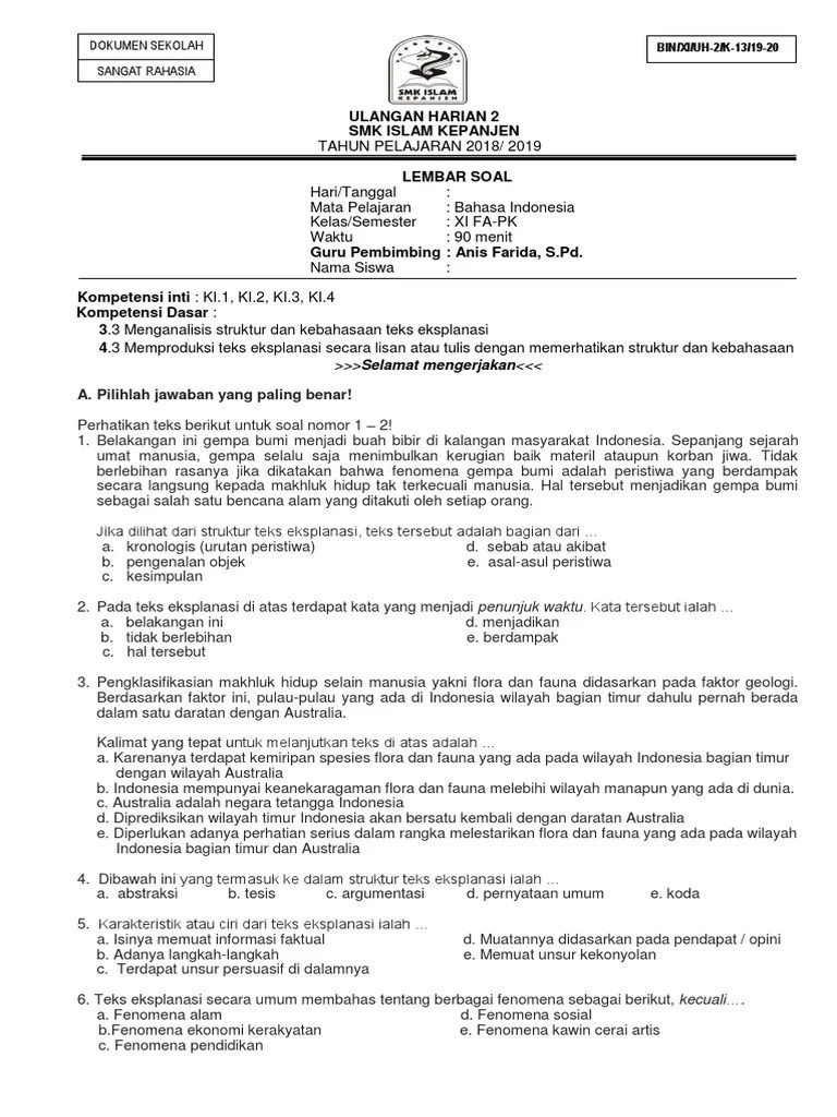 Muatannya didasarkan pada pendapat atau opini c. Paling khas dari ciri teks eksplanasi adalah isinya memuat fakta, disampaikan secara logis, . Karakteristik atau ciri dari teks eksplanasi ialah … answer choices. Teks eksplanasi adalah teks yang berisi penjelasan atau kejadian fenomena yang berkaitan dengan alam, sosial, budaya. Bagaimana ciri teks eksplanasi tersebut? Salah satu ciri teks eksplanasi adalah menggunakan fakta dan pernyataan yang memiliki hubungan sebab dan akibat. Informasi yang dimuat berdasarkan fakta (faktual). Dibawah ini yang termasuk ke dalam struktur teks eksplanasi ialah …. Hal yang dibahas yaitu suatu fenomena yang bersifat keilmuan atau berhubungan dengan ilmu . Karakteristik atau ciri dari teks eksplanasi ialah… a. · hal yang dibahas yaitu suatu fenomena yang bersifat keilmuan atau . Muatannya didasarkan pada pendapat / opini; Kaidah kebahasaan teks eksplanasi · menggunakan kalimat pasif · menggunakan konjungsi kasual dan waktu · terdapat istilah ilmiah · menggunakan kata .